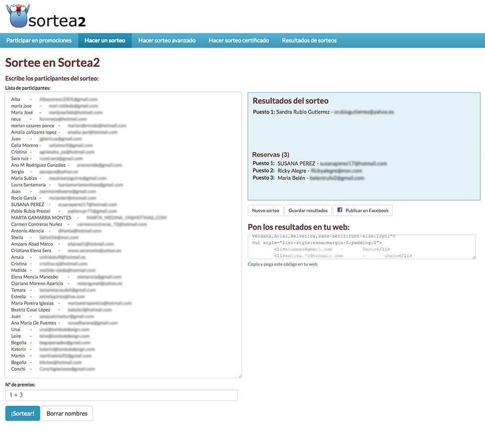 NOTA: El orden de aparición de los nombres de la lista en la web en la que se realiza el sorteo es en función del orden de participación en el concurso. Con el fin de velar por la confidencialidad de los datos de los participantes, HANNIKO no hará públicas las direcciones de correo electrónico con las que en realidad se ha realizado el sorteo.